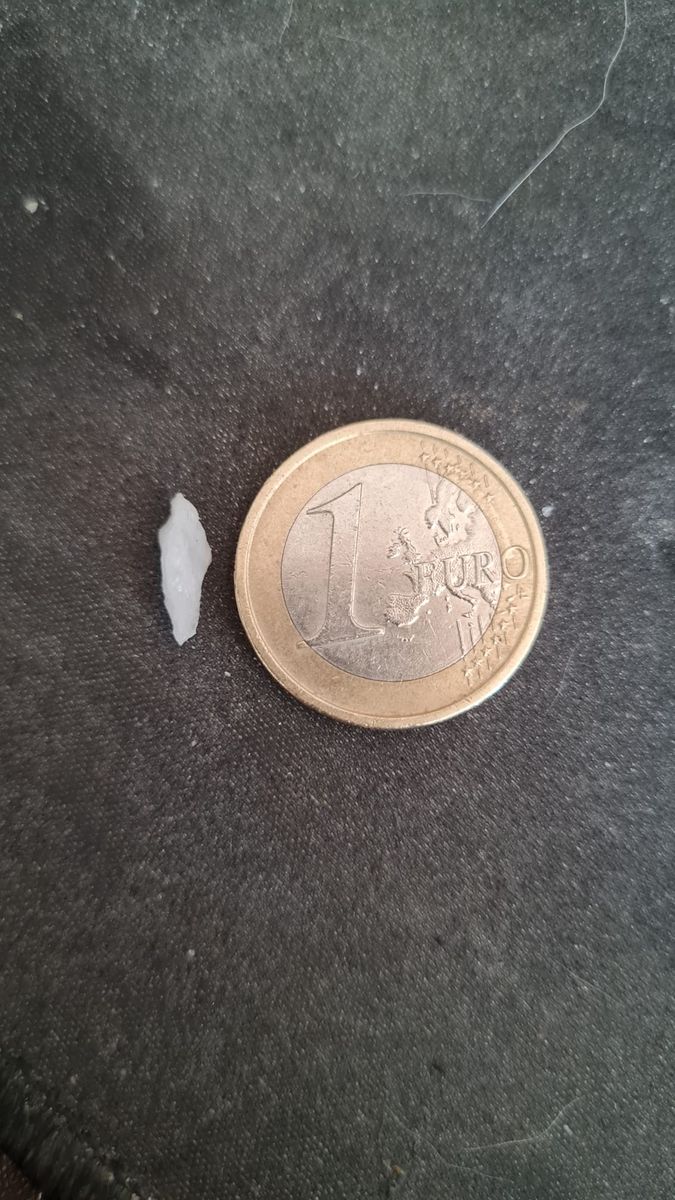 Er hat eine recht scharfe Kante, wie ein Steinzeitmesser, er befand sich links außerhalb der Mitte im vollem Material, nicht im Profil des Hinterrads.