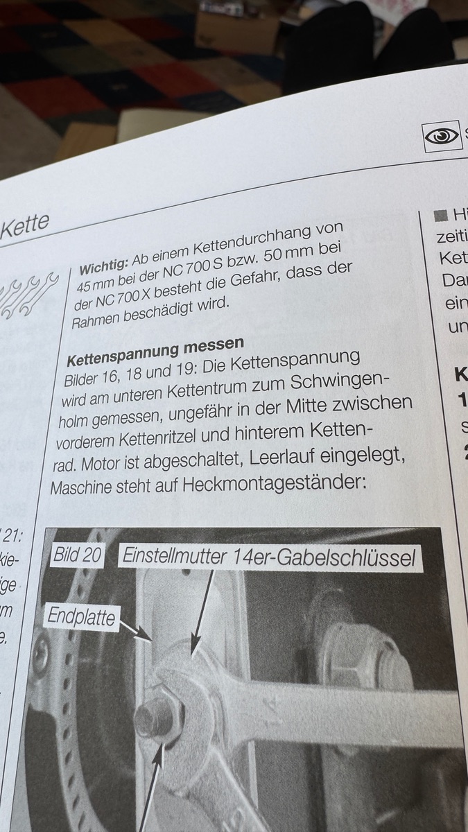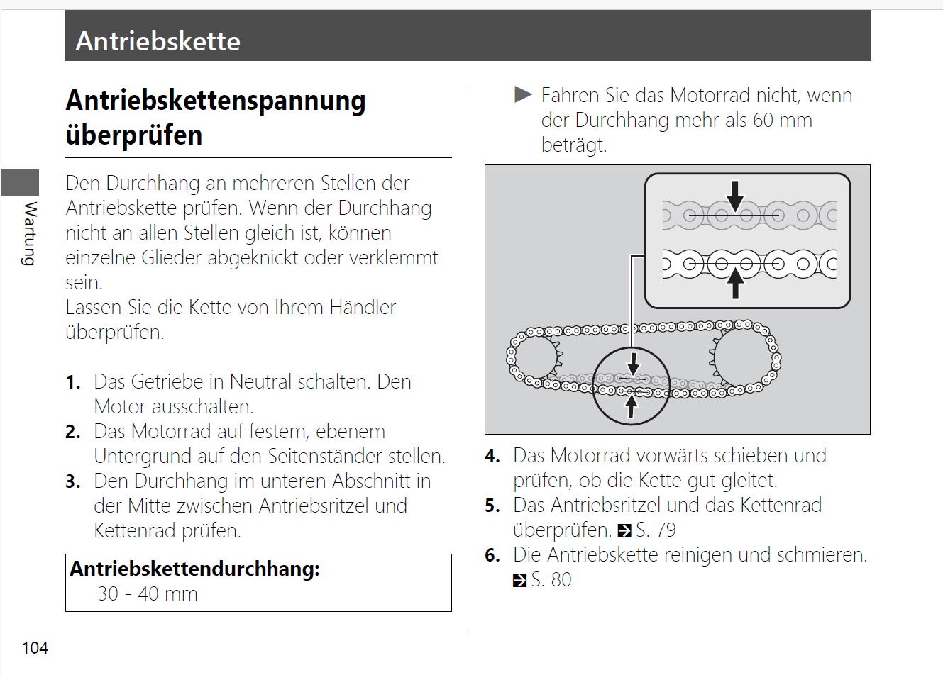 Am Dienstag habe ich bei Kilometerstand 139.283 den Kettendurchhang wieder nachgestellt. Er lag wieder bei knapp 35 mm, nach 2/6 Umdrehungen am Kettenspanner liegt er nun bei 25 mm.