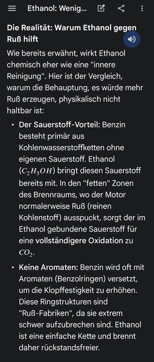 bedeutet: eigentlich sollten E10 Kraftstoffe weniger Ruß ausstoßen als Kraftstoffe mit geringerem Ethanol Anteil