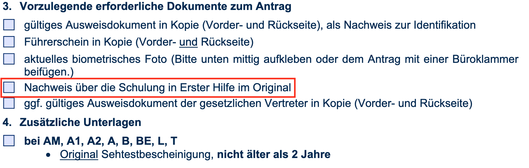 - Sich einen Erste - Hilfe - Kurs in der Nähe suchen, kostet ca. 50€ inkl. Sehtest und geht einen ganzen Tag lang. Das war echt interessant und eine gute Auffrischung. Falls man einen Nachweis hat, der nicht zu alt ist, entfällt der Kurs (ich meine, der Nachweis durfte in 2025 nicht älter als aus 2017 sein).