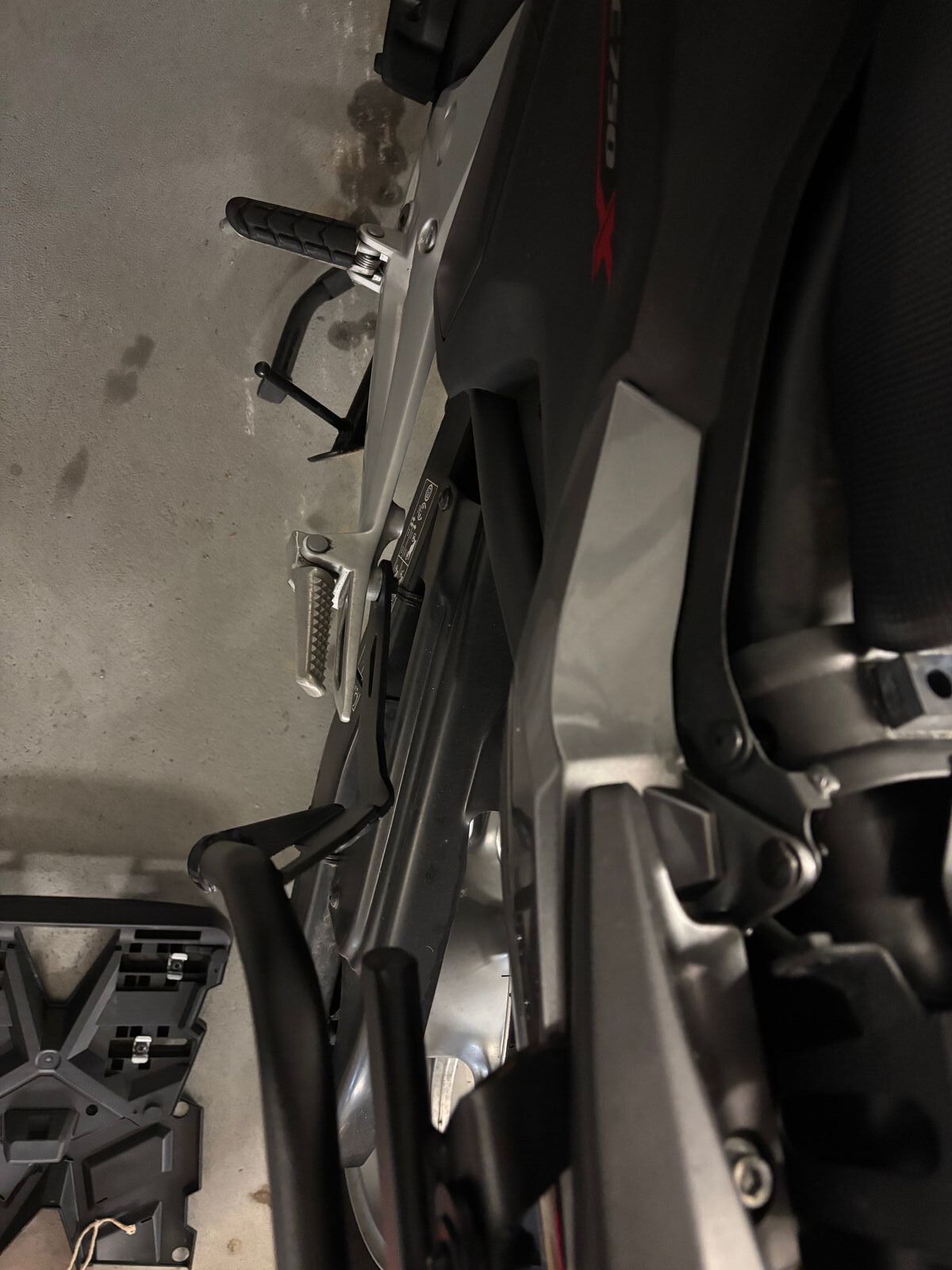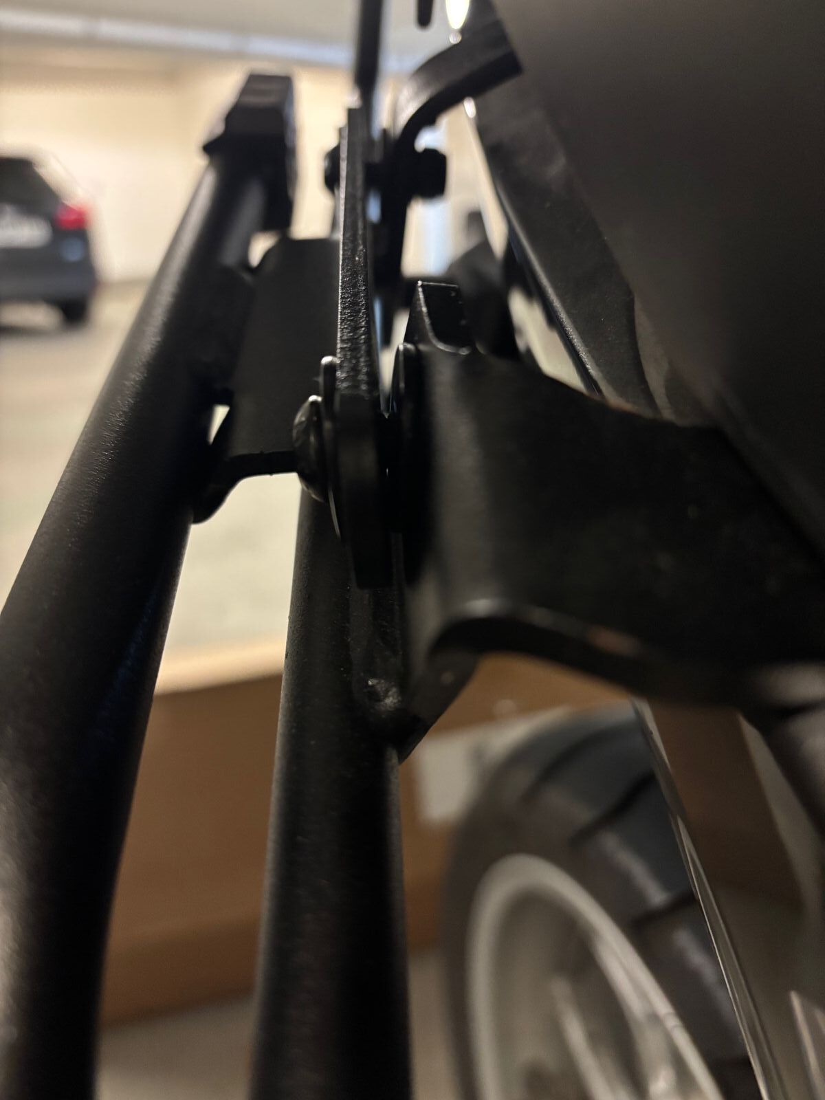 Ich habe dann den Topcaseträger demontiert um zu sehen, ob ich den Seitenträger dann problemlos dranhalten kann. Wen ich das mache, Steht die Halterung sehr weit von den Verschraubungen ab. Mit recht viel Kraft könnte man die Topcasehalterung dann auf die Verschraubung drücken, weiß aber nicht, ob so viel Spannung auf dem System sein sollte ![]()
