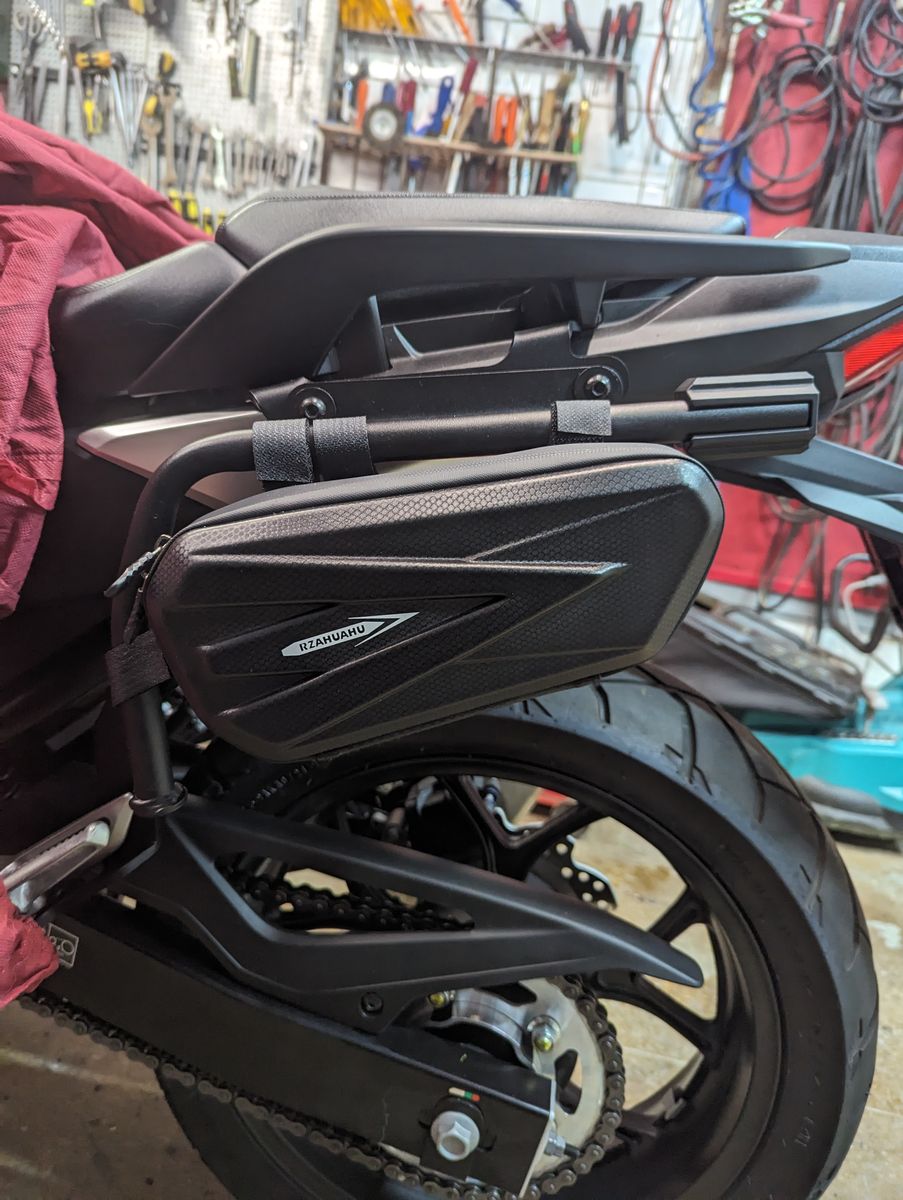 Biete hier mal meine kleinen Taschen an weil die durch etwas großere ersetzt wurden. Die haben 4 Laschen zum zurren die zwar nicht besonders lang sind aber für die Rohre der Träger Hinten wie Vorne passen.