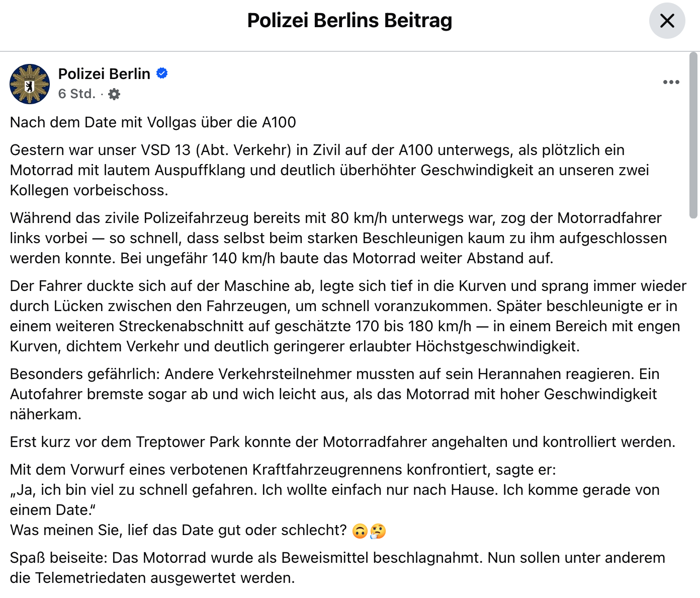 Heute hat die Polizei Berlin auf ihrer offiziellen Facebookseite gepostet, dass sie ein Motorrad beschlagnahmt haben, weil der Fahrer viel zu schnell unterwegs war. Um Beweismittel zu sichern, möchten sie die Telemetriedaten auslesen.