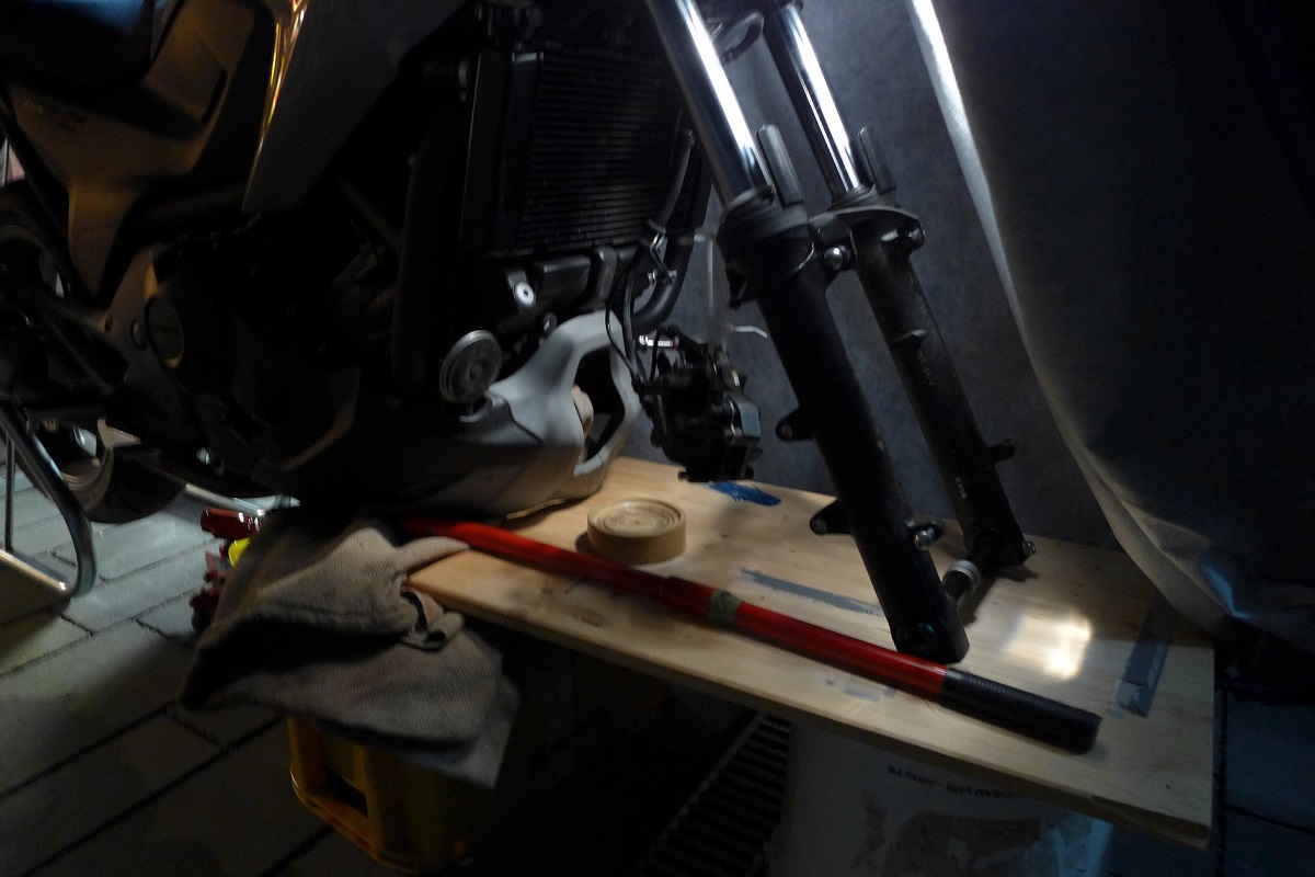 Schutzblech vorne habe ich gleich demontiert, dann kann ich nun bequem die Spritzschutzverlängerung verkleben. -