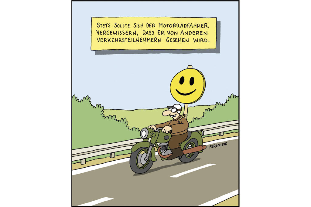 Und das machen sie über eine Reihe von kleinen Comicbildchen, die auf die markantesten Punkte im Zusammenhang mit Motorradfahren hinweisen. Nicht jeder ein Brüller, aber die Message kommt rüber und manchmal mußte ich trotzdem schmunzeln... ![]()