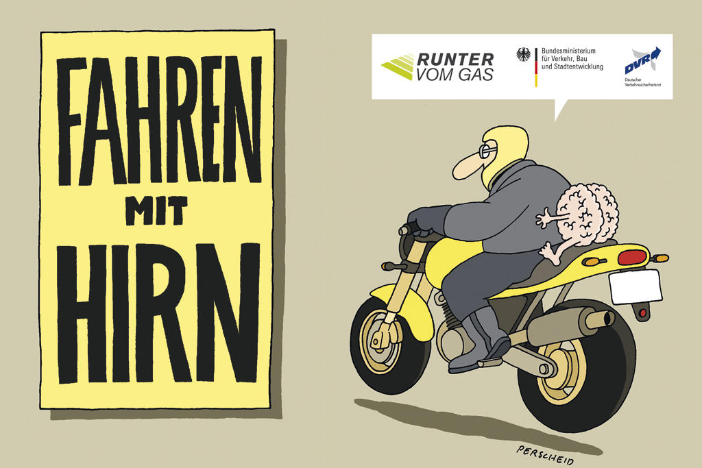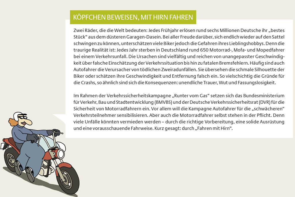 "Im Rahmen der Verkehrssicherheitskampagne „Runter vom Gas“ setzen sich das Bundesministerium für Verkehr, Bau und Stadtentwicklung (BMVBS) und der Deutsche Verkehrssicherheitsrat (DVR) für die Sicherheit von Motorradfahrern ein."
