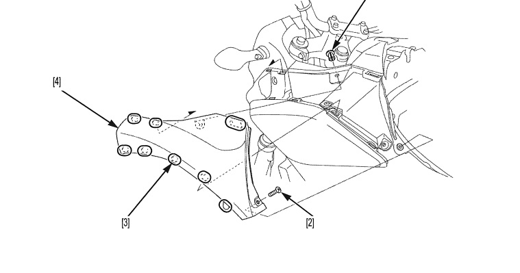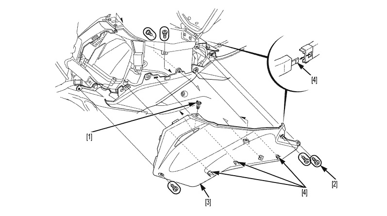 Man löst erst den linken Luftkanal (oben links neben Gepäckdeckel). Fahrersitz abbauen (zwei Schrauben hinten); neben Gepäckdeckel die Kreuzschlitzschraube, dann noch zwei Clipse lösen (Lenker rechts drehen, dann siehst Du die auf der Innenseite). Die Verkleidung nach hinten wegziehen.