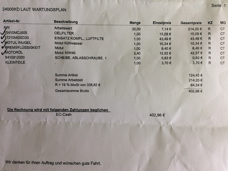 #142 Hier mal die Auflistung meiner letzten 24.000km-Inspektion beim Honda-Händler:
