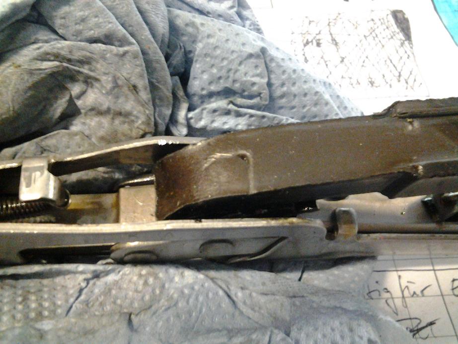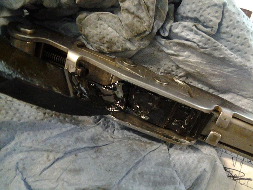 Er zeigte mir auch das defekte Teil: Die Kunststoffschiene des Kettenspanners hatte sich gelöst, dadurch war eine korrekte Spannung nicht mehr möglich ABER eine Gefahr des Überspringens der Kette bestand nicht, da die Feder nach wie vor spannt...nur mit ein wenig mehr Spiel eben.