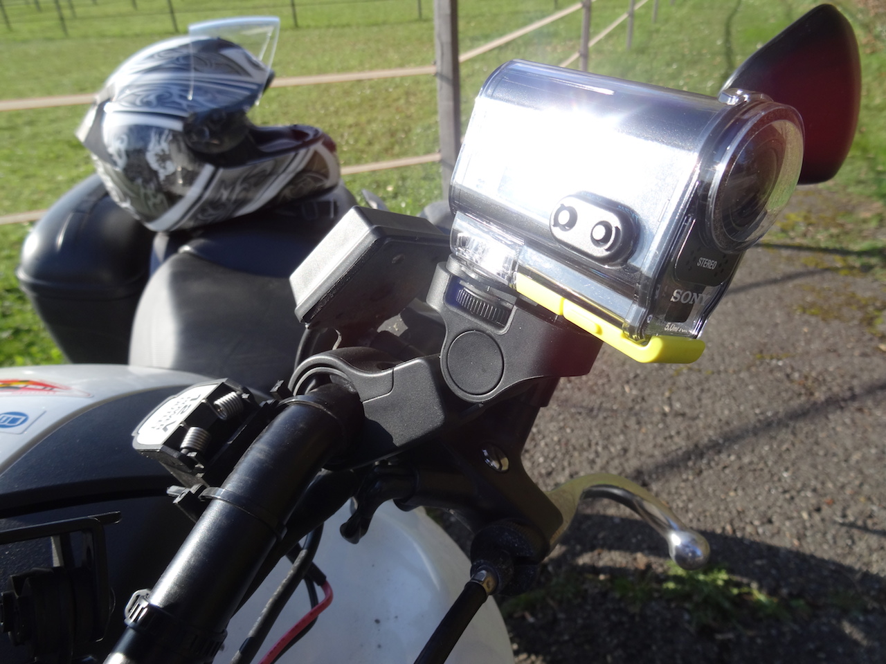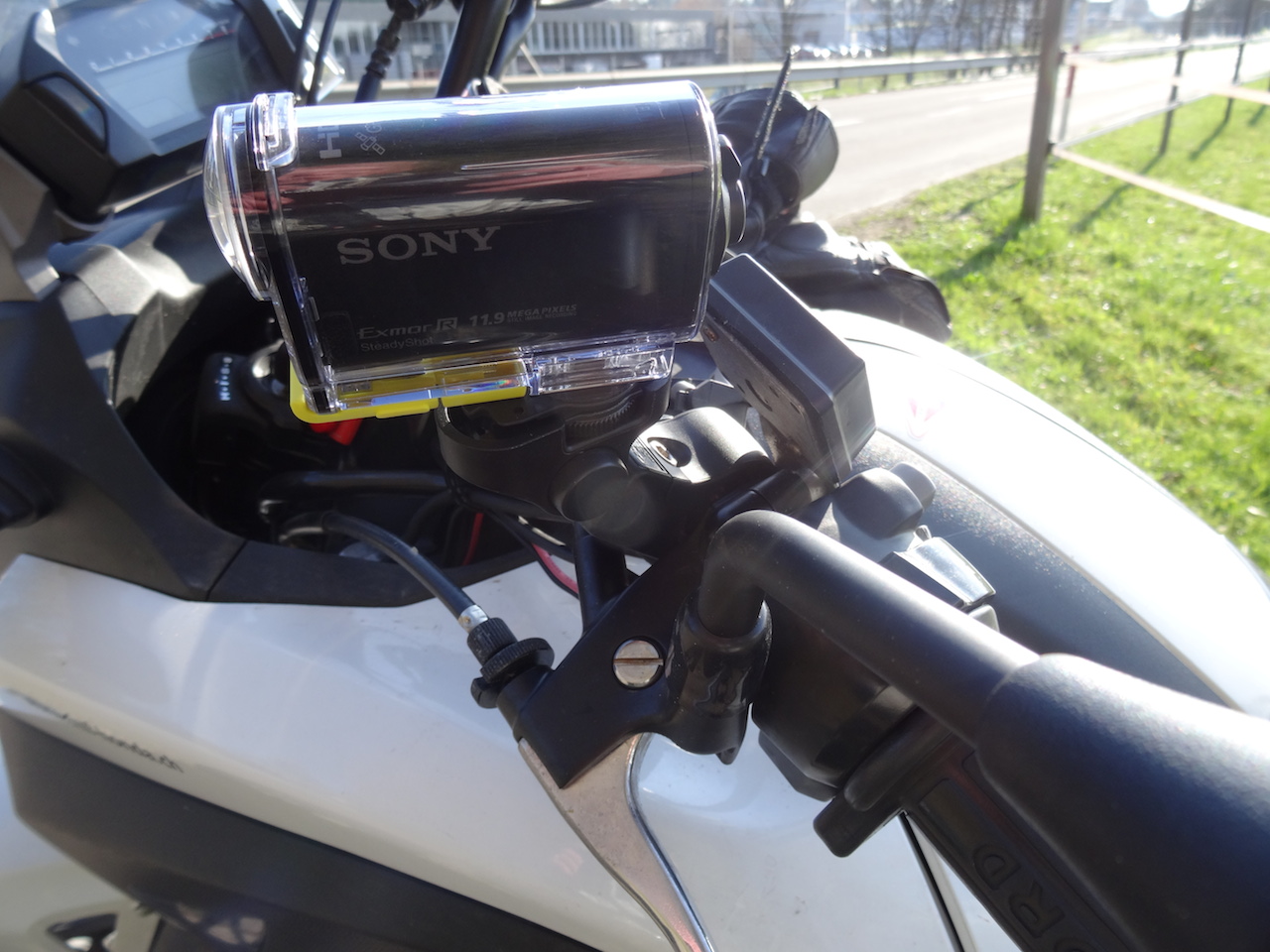 habe mich bisher gescheut, viele Euros für eine ActionCam auszugegeben :roll: . Daher habe ich mal meine normale SonyHandycam HDR-CX105E mittels einer Klapp-Rohrschelle improvisatorisch angebaut und getestet. Funktioniert bestens, gute Aufnahmequalität und wenige Wackler :dance: Als Gut-Wetter-Lösung