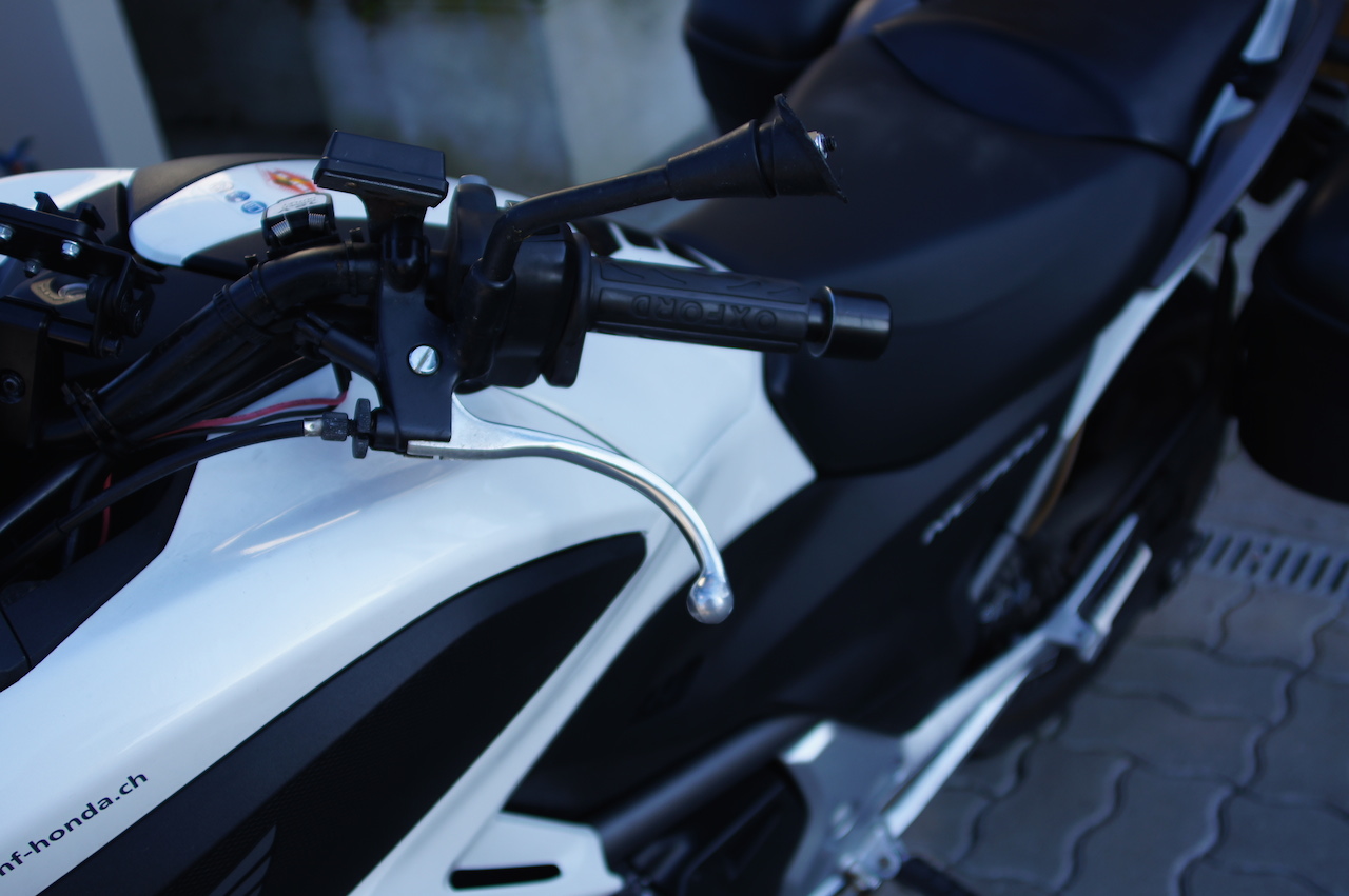 Heute nun als ich meine Orca auf unsern Vorplatz schieben wollte, bin ich über dieses Absperrbrett gestolpert. Zuerst konnte ich mich nochmals auffangen und dachte schon es sei vorbei, aber dann bin ich mit dem Fuss nochmals an dieses Brett gestossen und konnte mich nicht nochmals retten.... Orca hat sich hingelegt und ich bin in diesem Graben seitlich auf dem Rücken gelandet!! :o Hab mich dann wieder aufgerappelt und ein erster Check ergab dass ich vom Sturz etwas Schmerzen hatte, dies aber nicht schlimm ist. Dan wandte ich mich Orca zu und hab sofort festgestellt dass sich der Spiegel auf der linken Seite verabschiedet hatte. Aufstellen der NC ging problemlos und da es noch dunkel war einfach mal drauf gesetzt, gestartet und vorsichtig losgefahren. Beim ersten Schalten dann sofort bemerkt dass der Kupplungshebel und der Fussschalthebel verbogen sind. Ansonsten war nichts festzustellen. Also bin ich zur Arbeit gefahren. Ging alles problemlos. Nur mein Rücken meldete sich immer stärker.... So hab ich dann am Mittag wieder auf den Heimweg gemacht.... Hab dann auch mal einen Sichtcheck gemacht. Mein Kunstoffkoffer hat ne Schramme ist aber noch ganz, wie gesagt Schalt- und Kupplungshebel sind verbogen und Spiegel ist weg. Ansonsten ist nichts zu sehen.