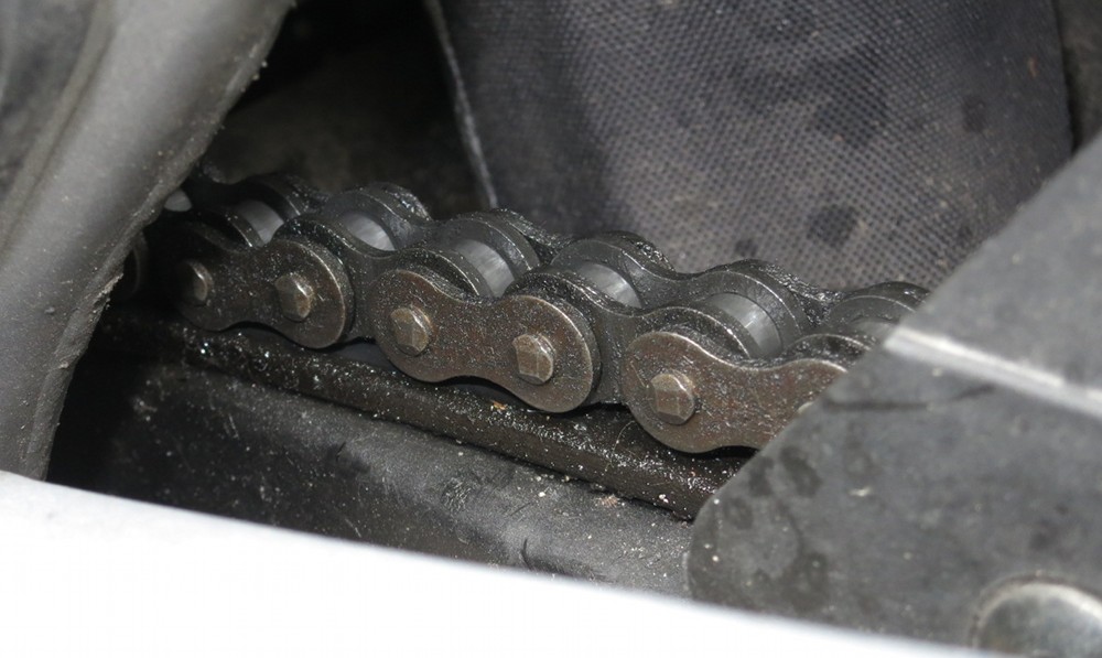 Gestern ist mir beim Fahren mit Sozia ein schleifendes Geräusch aufgefallen. Eben noch mal geschaut; die Kette liegt auf dem oberen Gleitstück auf. Auf dem Hauptständer mit eingelegtem Gang schlackert und rasselt die Kette ordentlich.