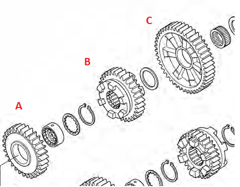 PPS: Ich hab noch ein Bild angehängt. Die Schaltung funktiert mit einer Schaltwalze, die Zahnräder auf Haupt- und Gegenwelle der Schaltung verschiebt. Die Zahnräder müssen einander einrasten, um den Kraftschluss herzustellen. Im Bild wird Zahnrad B (ist fest auf der Welle) verschoben und greift entweder in A oder C (die nicht mit der Welle verbunden sind), soweit ich das erkenne. Wenn die acht Zähne/Lücken nicht ineinander passen, gehts net weiter...