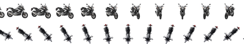 Wer natürlich Lust und zuviel Zeit hat, kann von seinem Hobel gern selber solche Bildchen erstellen. Einmal in 10° Schritten immer im gleichen Abstand (gleicher Radius zum Fahrzeugmittelpunkt) um sein Vehikel stellen, Bild schießen, Hintergrund ausschneiden, fertig. Hier mal ein Beispiel, wie das dann zusammengestellt für das Garmin-Programm aussehen muß (zumindest ein Auszug daraus):