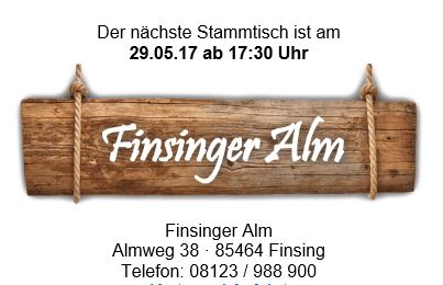 Der Münchner Stammtisch findet jeden letzten Montag im Monat ab ca. 17:00 in der Finsinger Alm statt.
