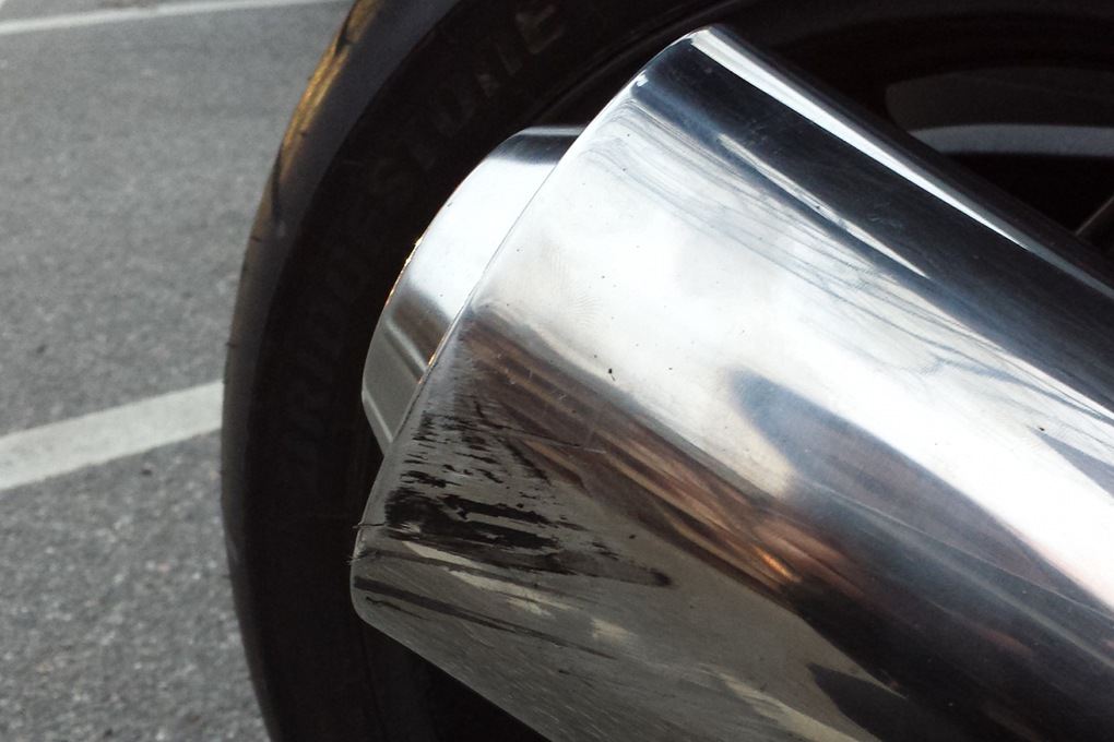 Bin nach links ausgewichen und von ihrer Stoßstange noch am Auspuff erwischt worden, siehe Bild. In den Gegenverkehr geschlingert, in dem zum Glück eine Lücke war, aber noch rechtzeitig wieder die Kontrolle zurückbekommen, so dass ich wieder auf meine Seite konnte.