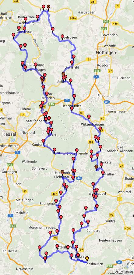 Ich habe noch zwei Pausen hinzugefügt. 1. Parkplatz an der Weser und 2. Parkplatz in Hessisch Lichtenau ca. 200 m zu http://www.cafe-im-brauhaus.de