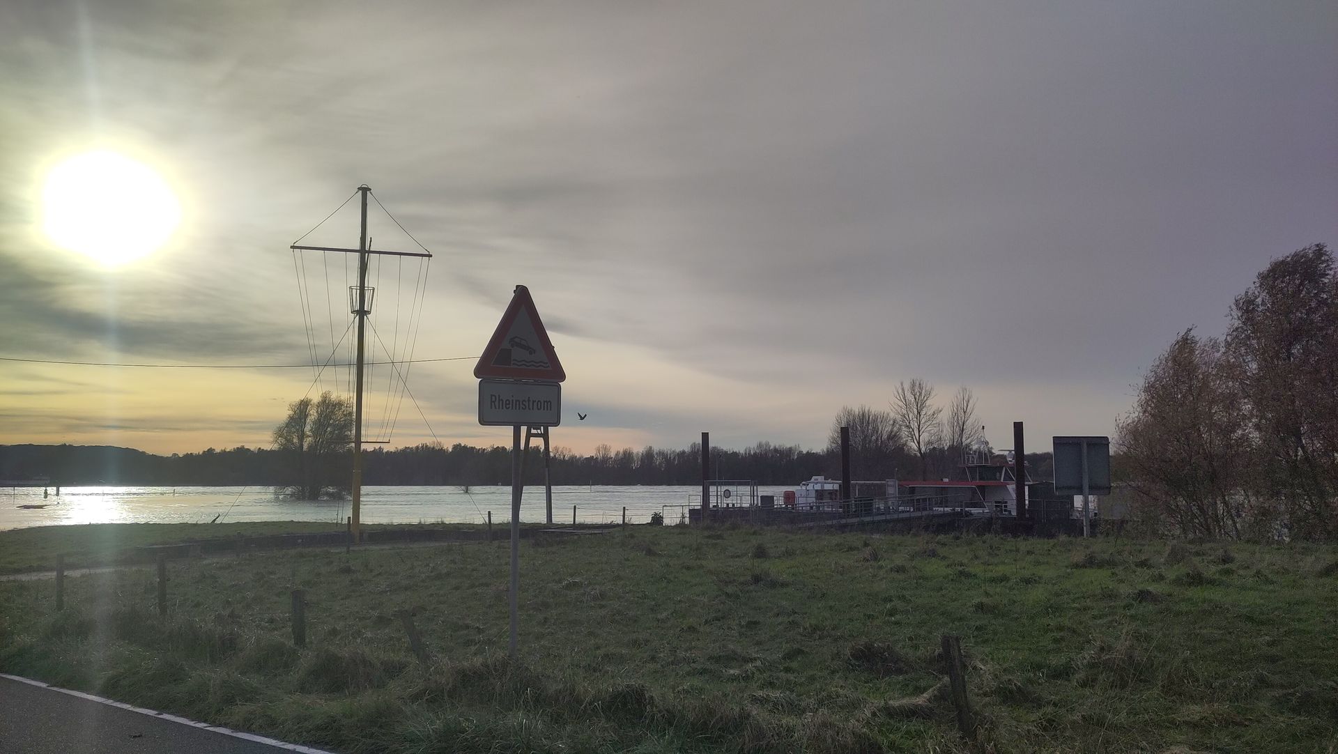 Am Ende dieser Straße ist bei normalem Wasserstand der Fähranleger für die Fahrrad- und Fußgängerfähre. Auch zu erkennen an dem Straßenschild mit dem Hinweis "Rheinstrom".