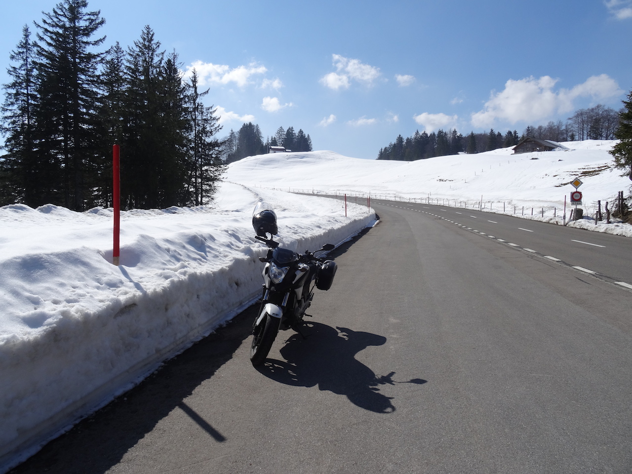 Nachdem ich erstmal wie immer nach Süden aus München rausgefahren bin und mich dann zum Sudelfeld durchgeschlängelt habe um a bissl Kurven zu kratzen bin ich nach Süden Richtung Steinberg am Rofan abgebogen. Dort dann schön Schotter gefahren, garniert mir einigen nicht umfahrbaren, komprimierten Schneefeldern. Also links, rechts die Kufen runter und alle Skills ausgepackt. Trotz ein paar brenzliger Momente und einmal steckenbleiben in nem schneebedeckten Anstieg ist alles ohne Umfaller gut gegangen. War so an der Grenze zwischen saugeil und saudumm :D Hätte gerne die GoPro dabei gehabt, aber die funktioniert mal wieder nicht.