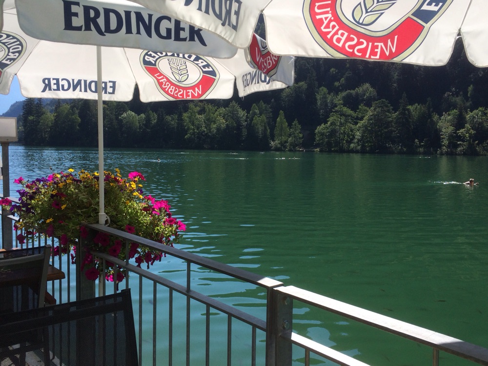Los gings nach einem Stärkungskaffee bei uns in Laufen. Unsere Strecke führte uns über Teisendorf über schöne Nebenstrecken über Anger nach Bad Reichenhall und direkt zu unser ersten Station dem Thumseewirt. Bei einen tollen Blick auf den Thumsee von der Terasse direkt am Wasser mit Blick auf die zahlreich vorhandene "Lebendverpflegung" in Form von richtig fetten Fischen, bestellten wir erst mal ein nachträgliches Frühstück, in Form von frischen Weißwürsten mit Brezen und einem kühlen alkoholfreiem Weißbier. Eingeschlossen der Blick auf eine Gruppe von Taucherlehrlingen