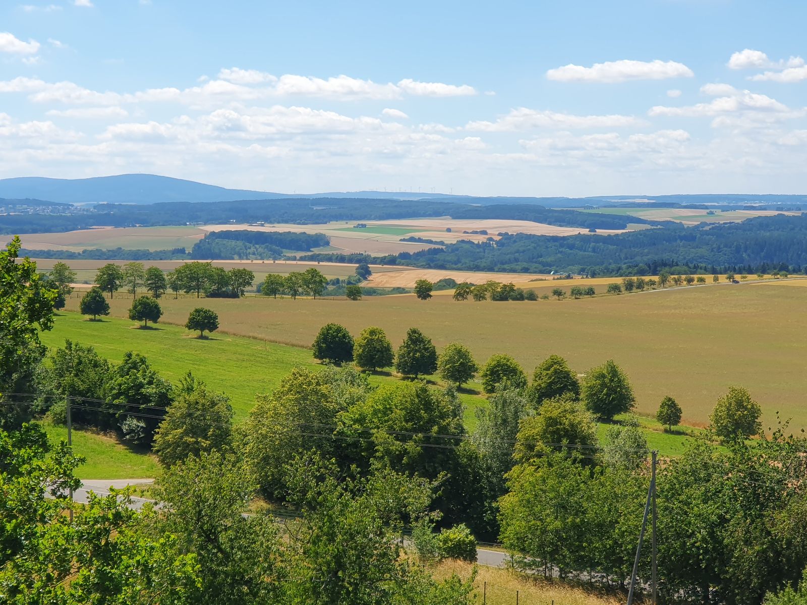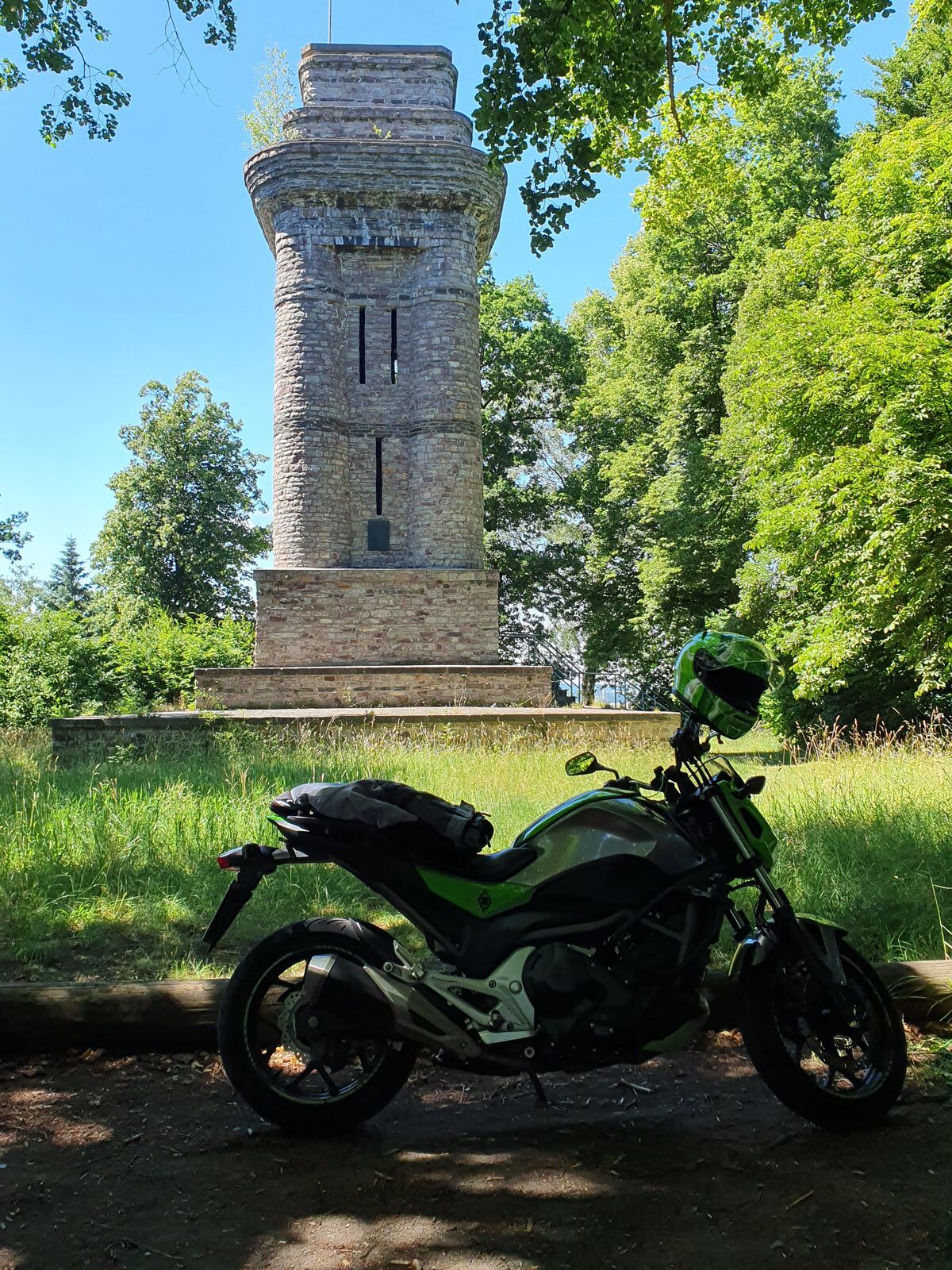 Ausblick vom Turm - links im Hintergrund der Idarkopf mit einem ebenfalls herrlichen Aussichtsturm. Der ist mit Mopped jedoch nicht legal zu erreichen. Wenn am WE Wanderer unterwegs sind, lasse ich das erst recht. Für die 2 km zu Fuß war es gestern definitiv zu warm - außerdem wartete noch ein letztes Ziel... siehe ganz unten.