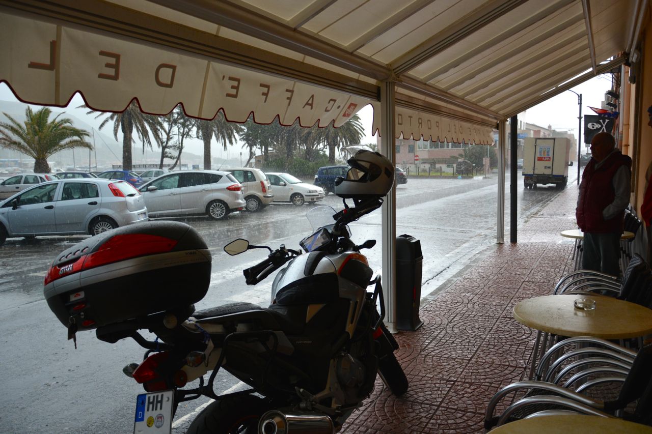 Das hilft nämlich gegen die Langeweile, wenn man 2 Stunden im “Café del Porto” sitzen darf, weil es draußen Blitz und Donner schlägt. Ich wollte nur mal eben die kleine Stadt und den Hafen erkunden. Anfangs sah’s auch gut aus, doch kurz nachdem das Gischt-Bild entstanden ist, platterte es wie aus Eimern. Ein Erlebnis war’s trotzdem…