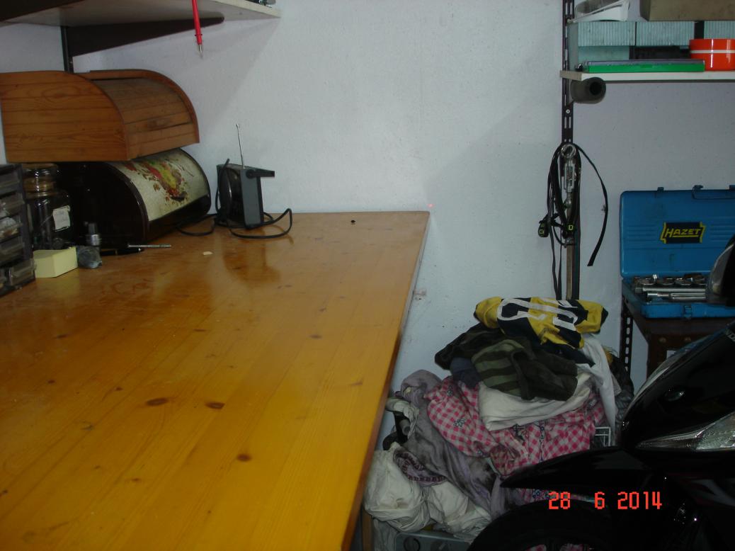 Anschließend die Höhe des Lasers (Mitte) mittels Schieblehre gemessen, und mir am Ende meiner Werkbank in gerader Linie mit der Kante in gleicher Höhe eine Markierung angebracht: