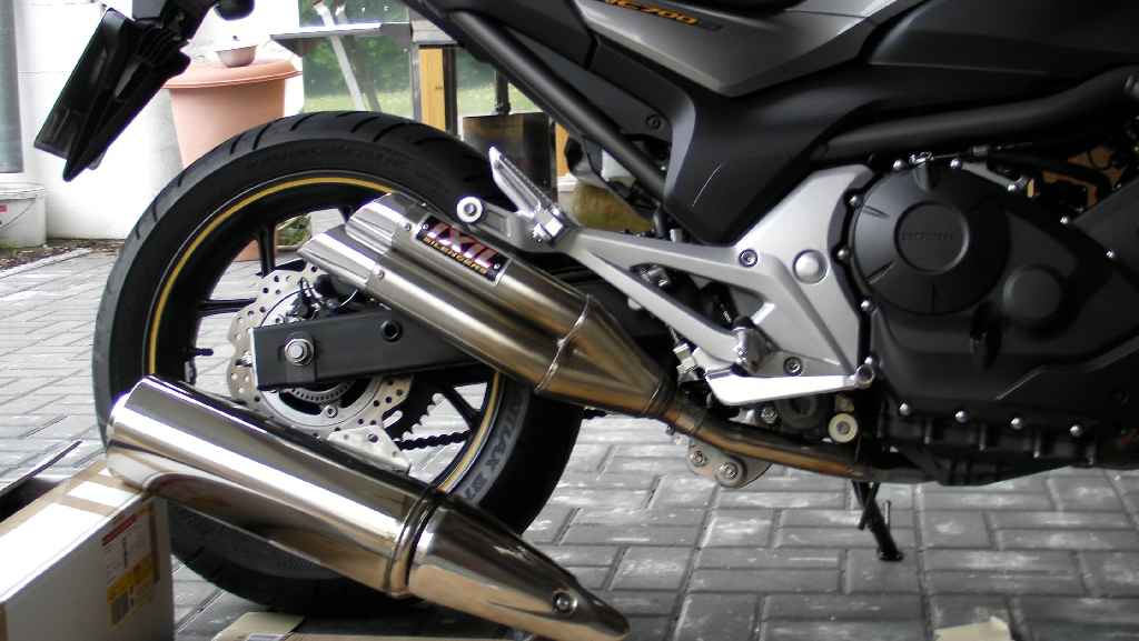 Habe den Ixil Hyperlow dran der sich meiner Meinung nach sehr gut in die Geräuschkulisse vom Motor einfügt und gut aussieht, eine Kotflügelverlängerung vorn und die Puigs Pro Crashpads, da sie mir vom Design am besten zur NC gefallen haben.