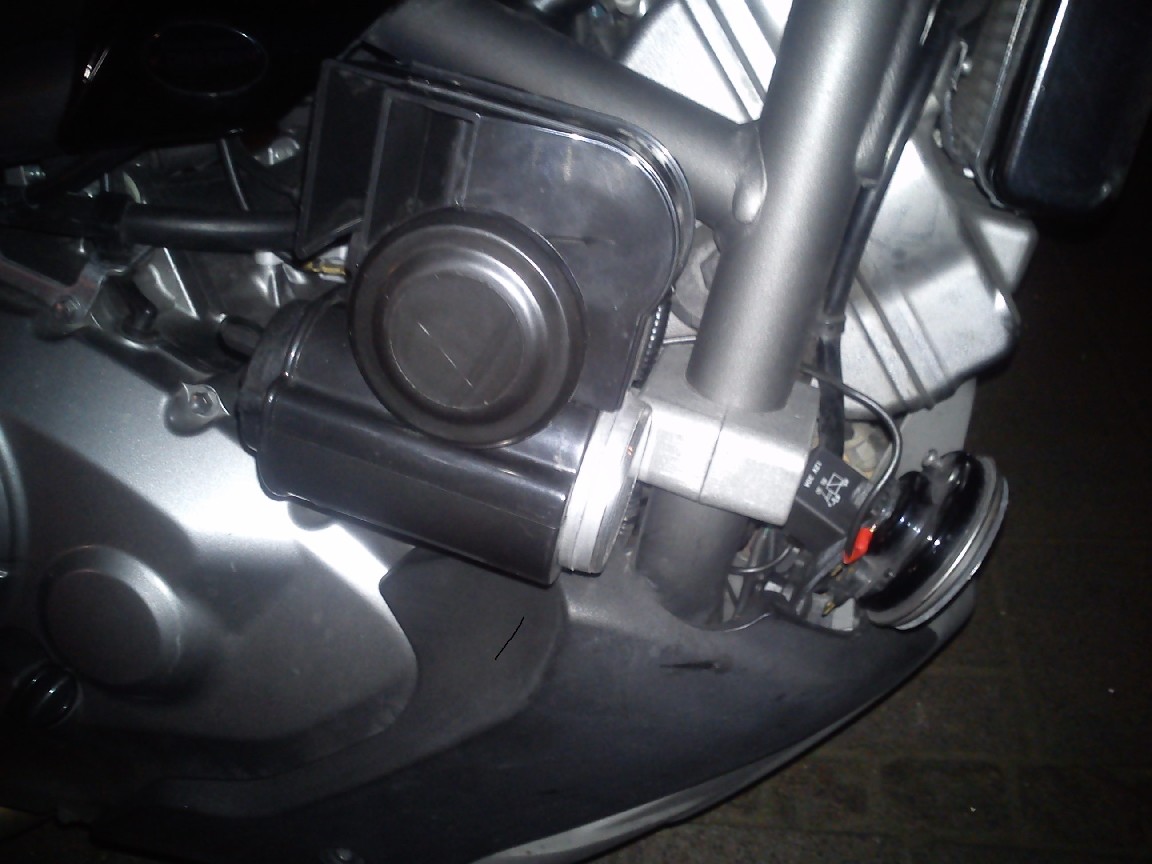 #49 So, nachdem ich am Sonntag eine hübsche Runde mit Didi gedreht habe, und dann abends um 19:45 Uhr wieder daheim war...hab ich ein bischen im Forum geschaut und noch so ein paar Sachen gemacht...gegen 22:00 Uhr konnte ich es einfach nicht mehr aus meinem Kopf kriegen, die Wolo Bad Boy doch noch zu montieren. Hatte fast alles da, nur die Schelle passte nicht an die dafür vorgesehen Stelle...aber irgendwie muß das doch daran dachte ich mir und fing an zu basteln...Sicherungshalter an die Batterie, Kabel verlegt und die Schelle halt an eine andere Stelle. Das Relais habe ich einfach hinter die original Hupe geschraubt und Masse habe ich da mit sonem Car-Hifi Dings auch abgenommen, da für die amtliche Schraube nix im Hause war.
