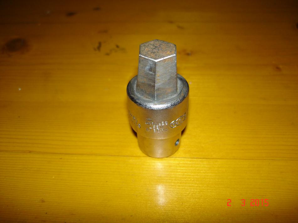 Evt. empfiehlt es sich auch noch, ein "Spezialwerkzeug" anzufertigen. Für solche Zwecke habe ich eine Inbus-Nuss leicht konisch geschliffen. Bevor ich den Schlagschrauber ansetze, wird die Nuss leicht festgeklopft.