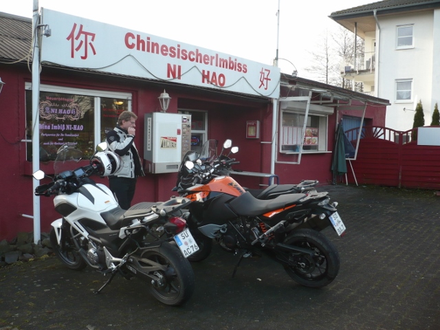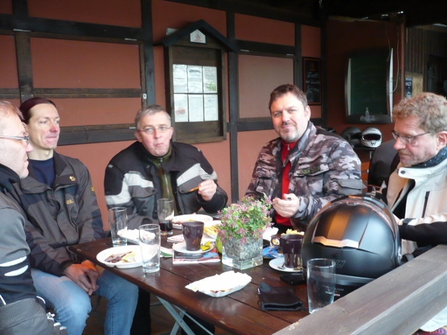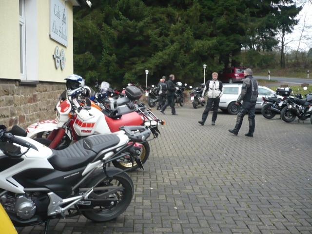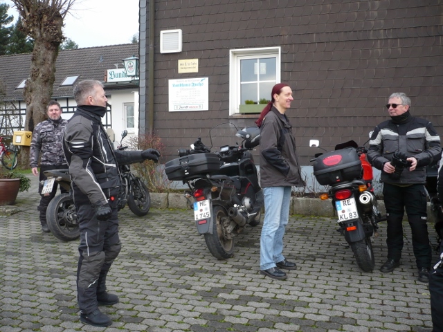 Start mit Roland, bei useligem Wetter, am Landhaus Fuchs. Dann Christian an der "Alten Schule" aufgegabelt. Da kann man hinfahren wann man will, da ist immer was los. Ist halt ein alteingesessener Bikertreff wo sich die "Winterharten" treffen.