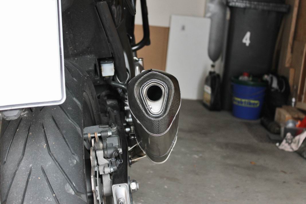 Die Frage zur Größe des ESD stand nicht nur einmal im Raum. Der Akrapovic ist durch die Carbonkappe geringfügig länger in seinen Abmaßen als der Originale. Direkt seitlich wirkt er zugegeben wuchtig, aber dank der Hexagonform von allen anderen Seiten relativ gefällig. Hab nach meiner Odenwaldrunde heute mal ein paar Bilder geknipst. Denke mal, es kommt ganz gut rüber, wie der Pott am Moped wirkt.