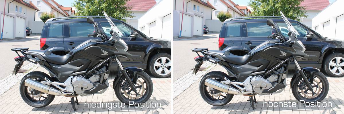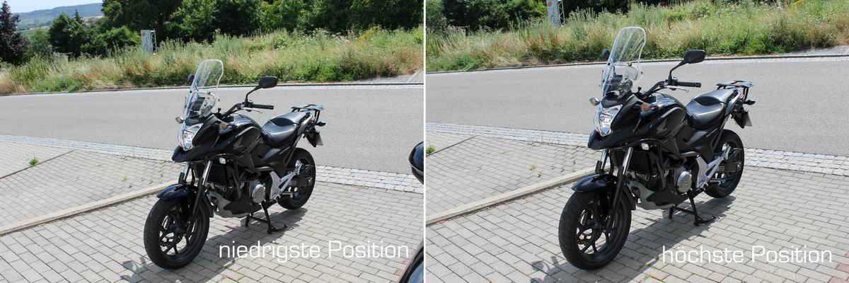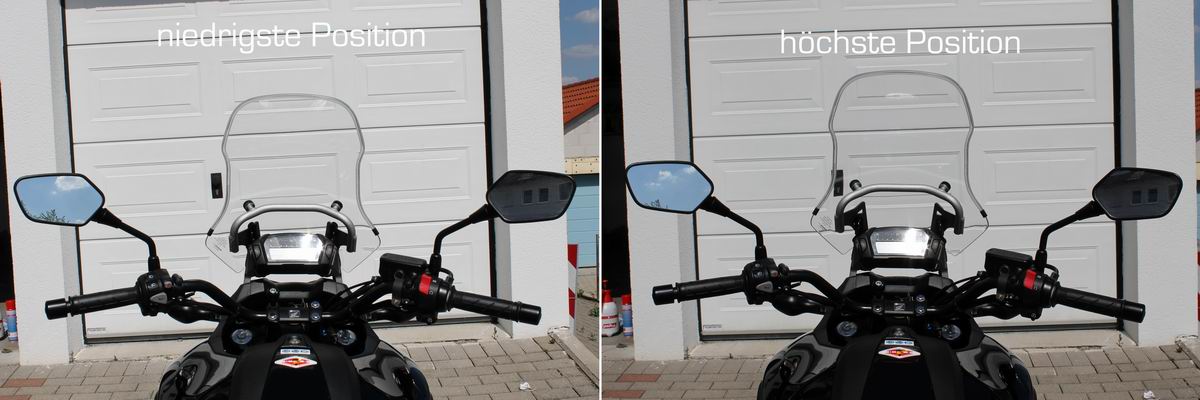 ) und in Kombination mit dem Bruudt-Windschildversteller vier Positionen durchprobiert: Bruudt-Versteller auf unterer Position im Halter der X und Scheibe auf unterster und oberster Position der Bruudt-Versteller, dann natürlich Bruudt-Versteller in oberer Position und Scheibe auf unterer, mittlerer und oberer Position.