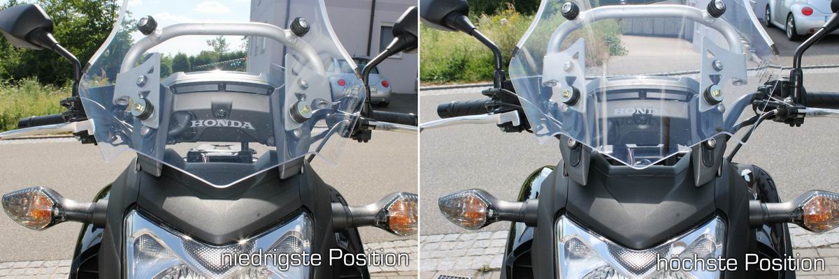 2 längere Schrauben: 0,irgendwas Euro im gut sortierten BaumarktKlar in der Kombi kein Schnäppchen, aaaaber du hast eine stufenlose Verstellmöglichkeit, die dir nur noch der Vario-Screen von MRA noch bieten könnte. Und ich trau mich ganz ehrlich mit der Honda Tourenscheibe auch schmerzfrei lange hohe Geschwindigkeiten auf der AB zu. Die anderen Scheiben haben keinen zusätzlichen Bügel, der die Scheibe weiter oben nochmal abstützt. Bei allen Zubehörscheiben, die die Aufnahmen der kleinen Originalscheibe nutzen, hast du erheblich größere Biegemomente an den Anschraubpunkten, die Scheiben dürften zum Flattern neigen und irgendwann dank Wind und UV Ermüdungsstellen und u.U. vielleicht sogar blinde Flecke dort bekommen (das ist aber nur eine Vermutung).