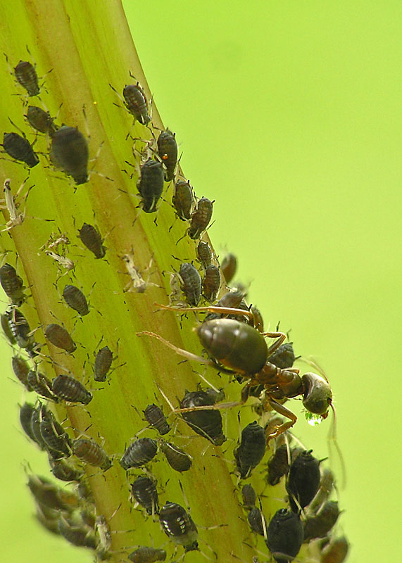 Ich hatte vor einigen Jahren mal Ameisen bei der Futterpflege fotografiert, man sieht sogar den Sirup den sie aus der Blattlaus gemolken hat: