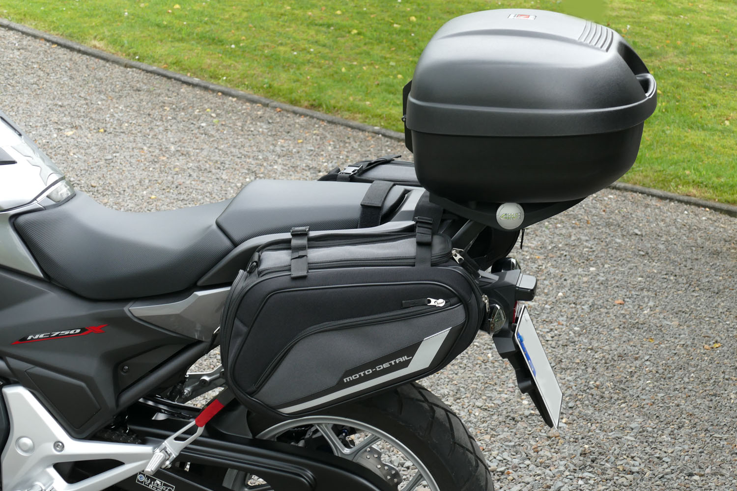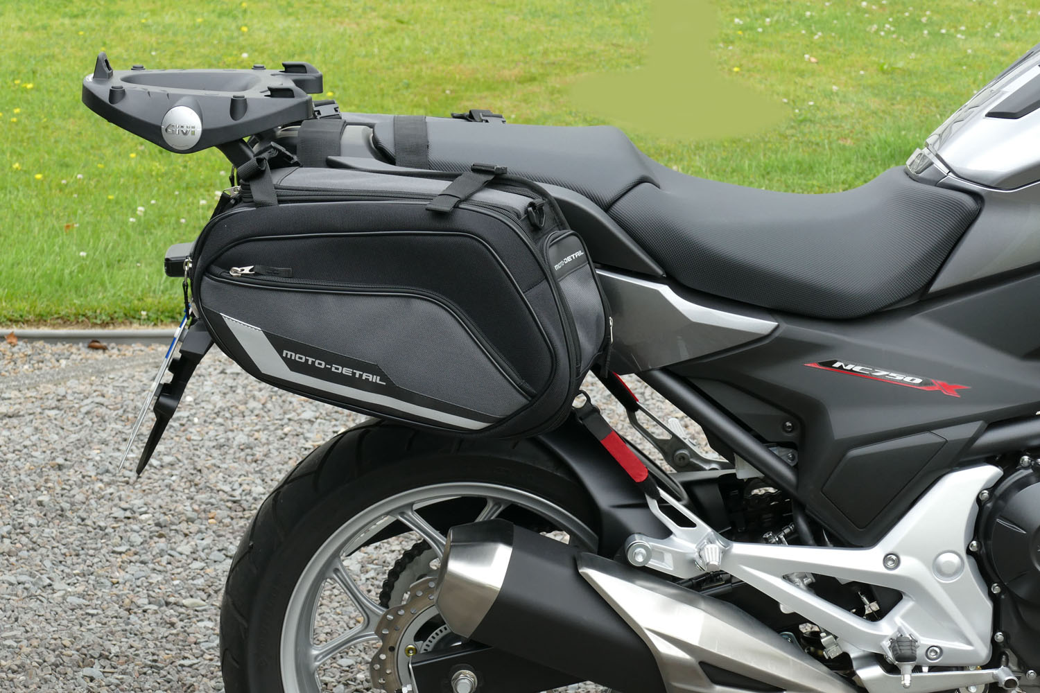 #19 Wenn es für mehrere Tage auf Tour geht montiere ich an meiner NC 750 X die Satteltaschen von Moto-Detail (Louis), Art.-Nr. 10027825, in Verbindung mit einem Givi Topcase. Tanken ist kein Problem. Von den drei Klettbändern muss nur das mittlere geöffnet werden. Das vordere Klettband ist unter dem Sitz durchgeführt und das hintere liegt außerhalb des Soziussitzes.