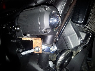 Über Zusatzscheinwerfer ist hier ja schon viel geschrieben worden. Mir geht's hier um die Befestigung direkt am Rahmen ohne teure Sturzbügel o.ä. Die Hawk-Nebler von SW-Motech hab ich mal provisorisch direkt an meine 750S geschraubt, mit einer gummierten Rohrschelle und einem L-Winkel. Im Bild rechts oben eine Ecke des Kühlers, unten die Hupe: