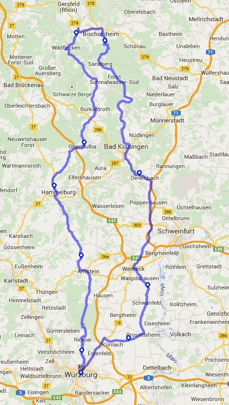 Der Plan: von Würzburg über Arnstein, Hammelburg, Oberthulba nach Bischofsheim in der Rhön und über Bad Kissingen, Oerlenbach, Scheinfurt, Waigolshausen wieder nach Würzburg.