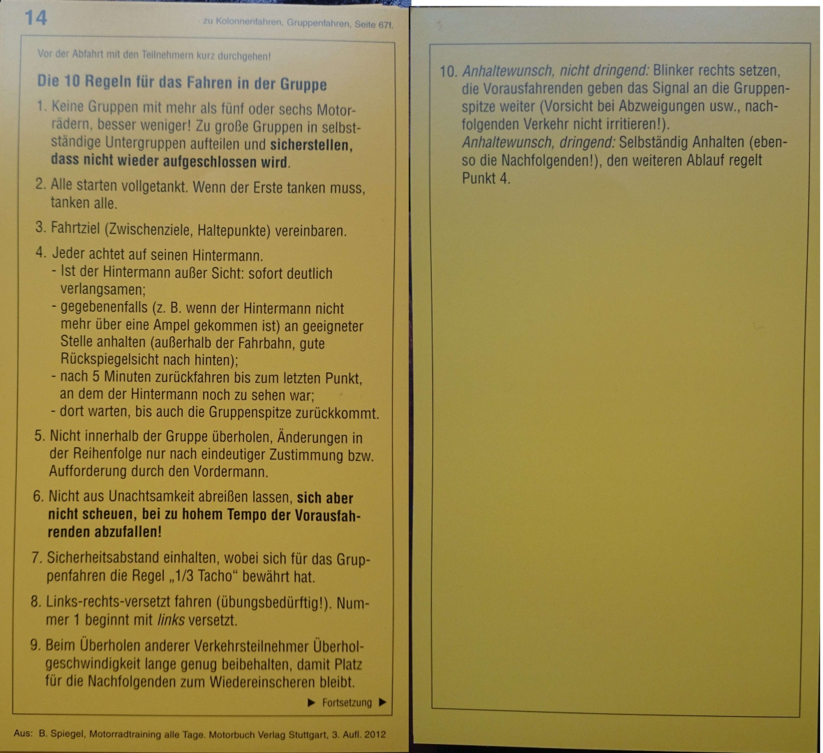 seit letztem August habe ich meinen Führerschein und ein netter Arbeitskollege hat mir Bernt Spiegels Die obere Hälfte des Motorrads geschenkt. Im dazugehörigen Trainingsbuch, das ich mir zu Weihnachten gegönnt habe, stehen die angehängten Regeln zum Fahren in der Gruppe/Kolonne.