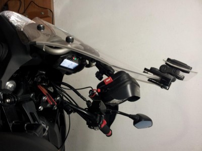 Genau. So habe ich das früher auch gemacht. Ich fand das aber stets ziemlich lästig, weshalb ich auf eine Touratech-Halterung umgestiegen bin. Die GoPro muß ich aber noch immer abbauen. Übrigens habe ich die große Scheibe nun nicht mehr dran und will sie mit dem RAM-Halter verkaufen, weil ich für die Scheibe ein wenig zu groß bin, siehe hier (Klick!). Ich habe nun links und rechts an den Haltern der Griffarmaturen jeweils eine RAM-Kugel.