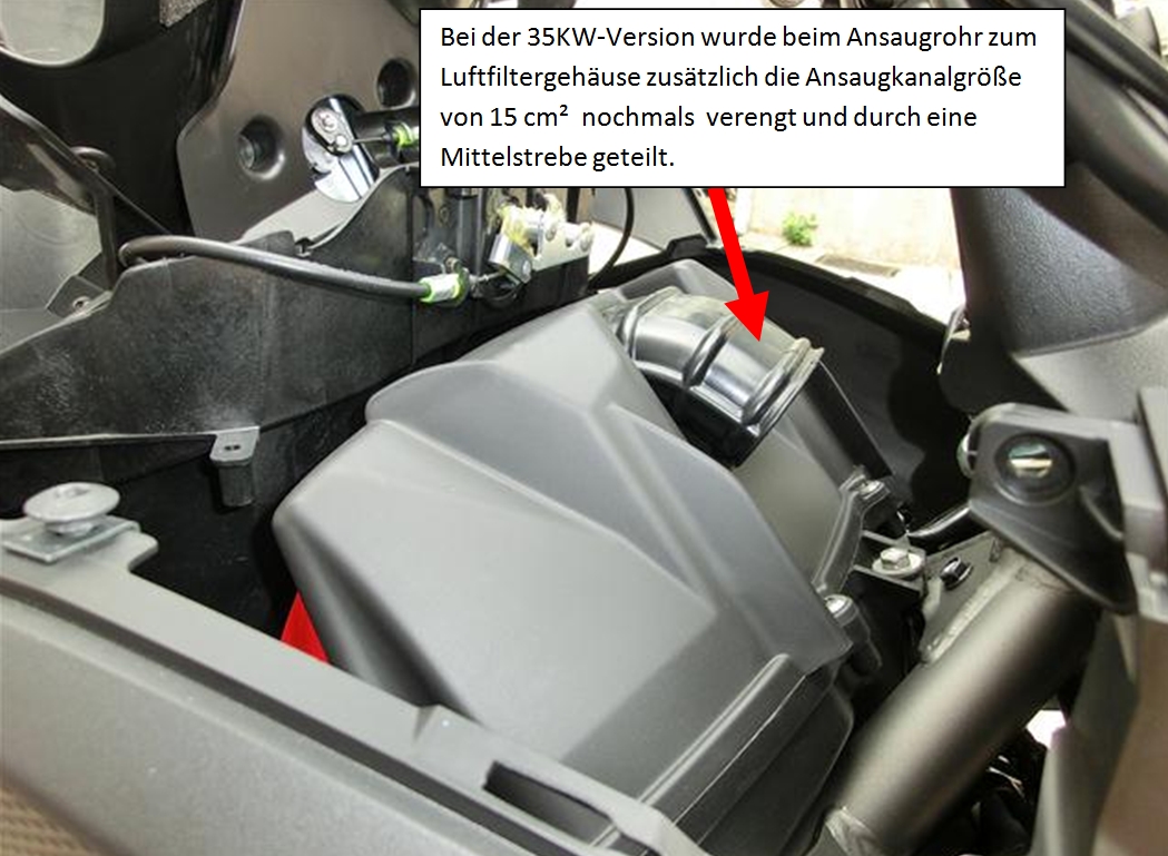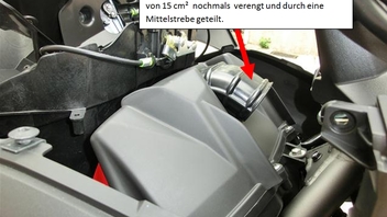 Da hast Du übrigens richtig geschaut. Der Ansaugkanal zum Luftfiltergehäuse (Rüssel/Schnorchel) ist zweigeteilt und auch nochmal künstlich verengt. Aber es bringt momentan nichts "nur" daran etwas zu ändern.