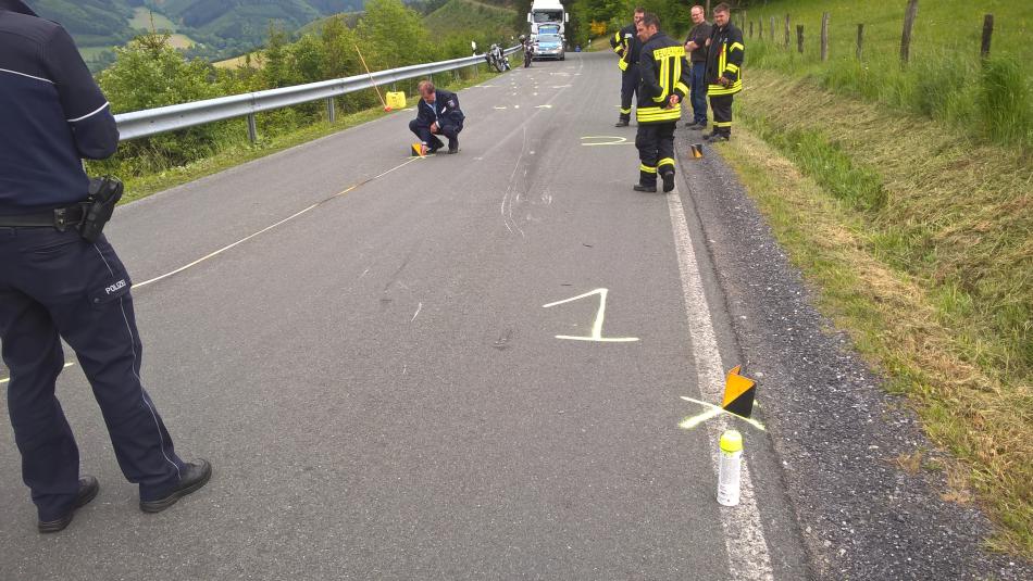 Zum Glück habe ich das sofort mitbekommen und gedreht. Mein Bruder lag halb unterm Mopped und war bewußtlos. War das vielleicht eine scheiß Situation... . Habe versucht, das schwere Teil hoch zu bekommen, aber weil er dazwischen lag, konnte ich das Mopped nicht richtig anpacken. Zum Glück hielten dann die ersten Autofahrer und haben mir geholfen. Helm vorsichtig ab, ansprechen - keine Reaktion. Puls und Atmung waren aber ok, also erst einmal keine Panik. Ich habe ihn lieber so wegen evt. Rückenverletzungen liegen lassen. Zum Glück kam sehr schnell die Feuerwehr aus dem Nachbarort. Die haben ihn erst einmal stabilisiert.