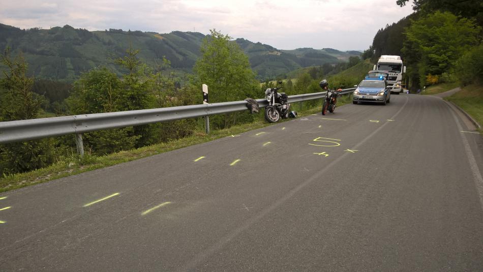Wie das passieren konnte? Keine Ahnung! Wir waren schon recht flott unterwegs, aber das war keinesfalls grenzwertig. Als ich ihn im Rückspiegel gesehen habe, war das Mopped komplett auf der Straße. Anhand der Sturzstelle (recht nah am Fahrbahnrand) vermute ich, dass er kurz unachtsam war und in den Grünstreifen geraten ist. Das ist sicher kein Problem für meinen Bruder (MTBler), allerdings hatte es eine recht hohe Kante zur Straße. Ich denke, er hat versucht, wieder auf die Straße zu fahren, dabei kam das Mopped wegen der Kante quer.