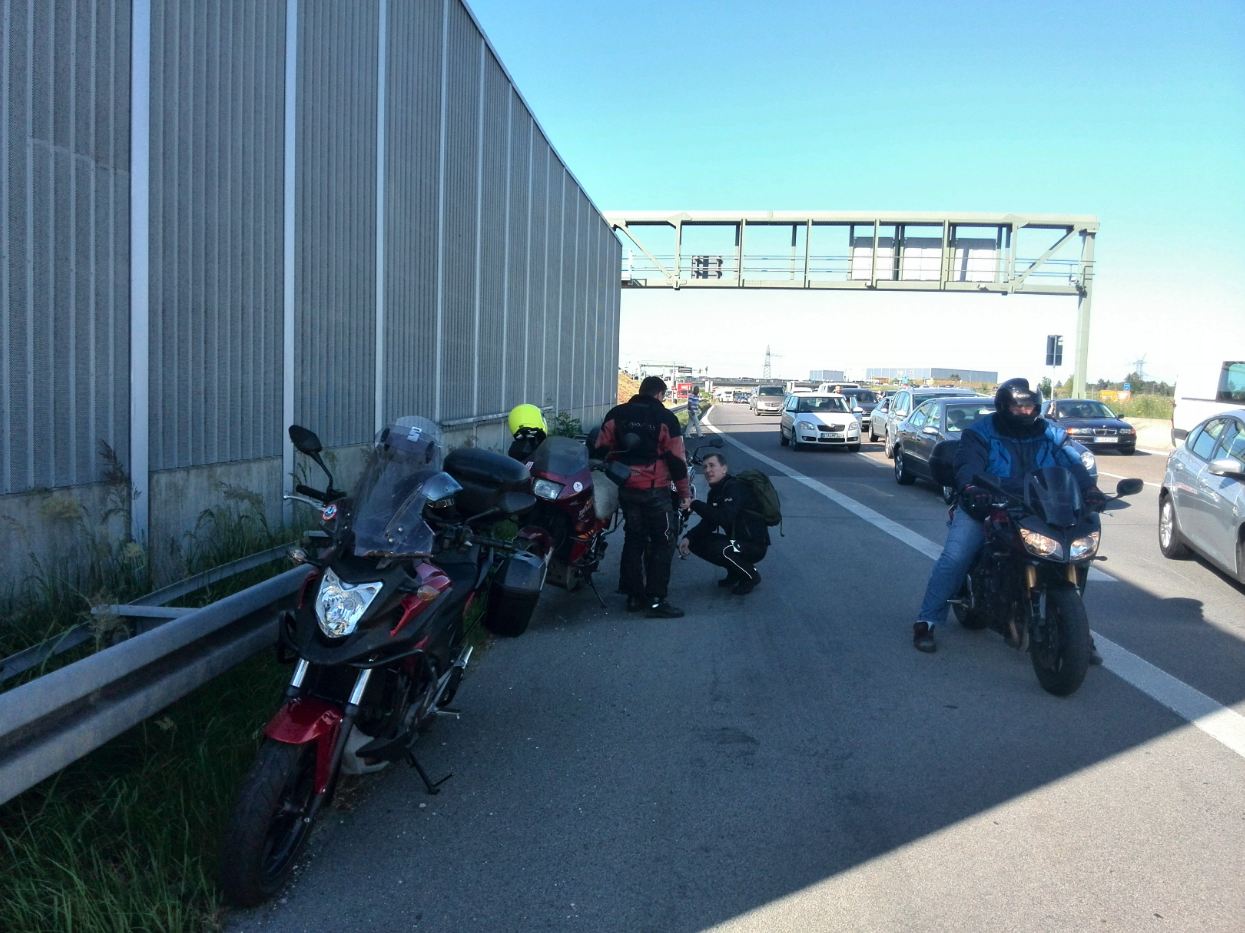 Zum Glück konnte ich mich in den Schatten einer Schallschutzwand stellen wo ich bald Gesellschaft von weiteren Moppedfahrern bekam.