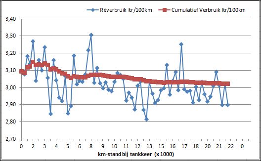 Blaue Linie ist Verbrauch zwischen zwei Betankungen, die rote Linie ist kumulatives Verbrauch bei angegebene Gesamtkilometerstand.