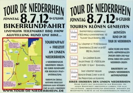 Am 8.7.2012 brummt der Niederrhein zwischen Kleve-Krefeld und Mönchengladbach. Zu einer offenen Sponsorentour laden ganztägig vier niederrheinische Bikertreffs ein. Zwischen Rhein und Maas werden über Flussdeiche, Pappel- und Kopfweidenalleen zahllosen Bikern die Besonderheiten des Niederrheins gezeigt. Fahrten über den Niederrhein gelten zu Unrecht als platt und kurvenarm. Den Beweis erhält jeder Teilnehmer, der an der kostenfreien Niederrheintour teilnimmt.