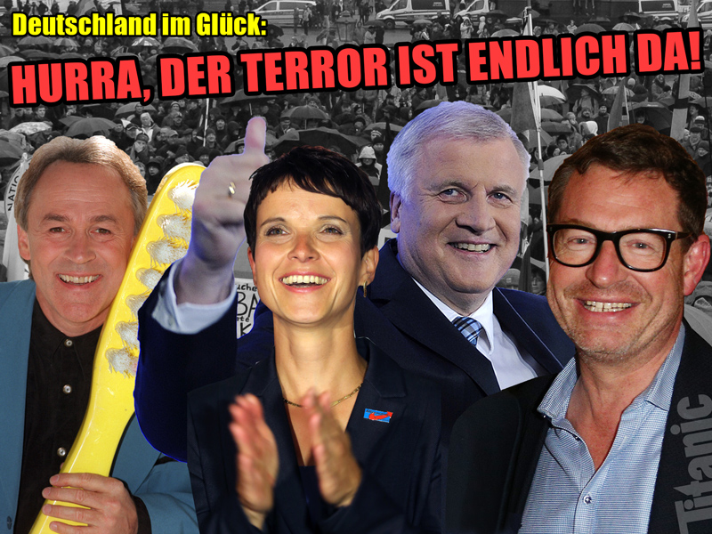 ) aber vielleicht der Verfassungsschutz, dann evtl. der bayrische, da ja Horst....Nee Leute, tief Luft holen, es gab einen Anschlag, ja, aber darauf hat man ja gewartet, ob aus Angst, oder weil man es dann ausschlachten kann, gell??