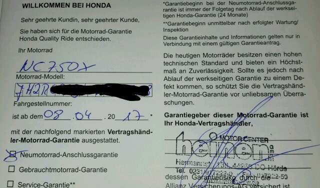 Nur dadurch habe ich die Honda Garantie bei allen Händlern. Ist die Garantie im Kaufvertrag festgeschrieben, gilt diese doch nur zwischen den Vertragsparteien. Geht der Händler pleite, ist die Garantie futsch.