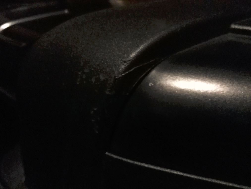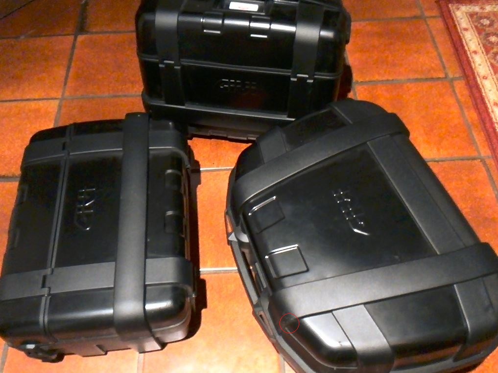 Einzig das Topcase hat einen kleinen Defekt/Kratzer an der Kunststoffumrandung rechts, der aber nur nach Hinweis auffällt (siehe Bild, rot umrandet).