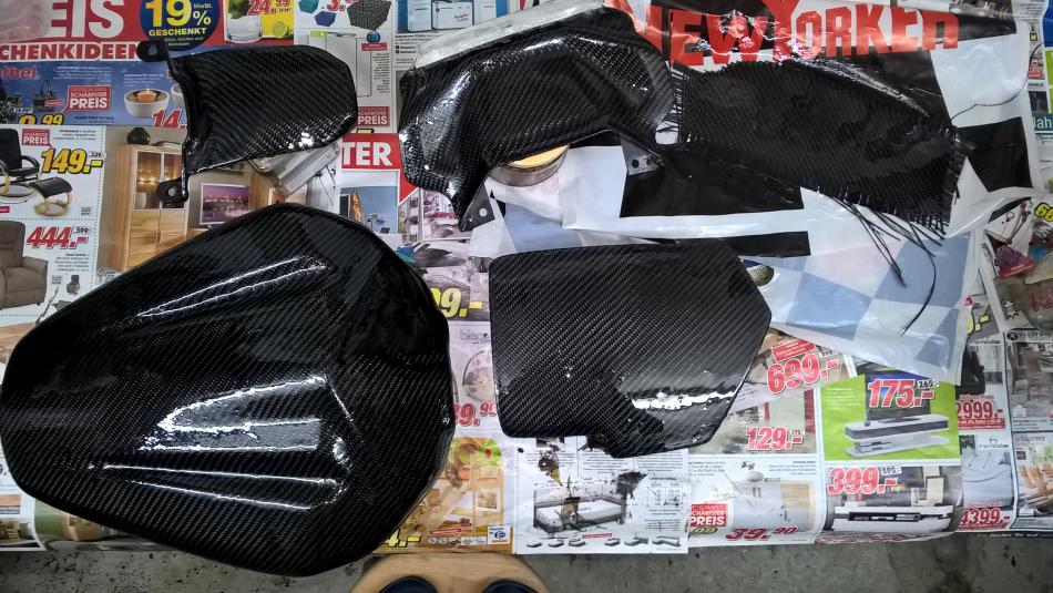 Danke für die Tipps - mir gehts ja nur um die Optik und nicht um die paar Gramm Gewichtseinsparung, daher auch keine tragenden Teile (welche auch?) aus Carbon.Und danke für die Blumen (@all)!